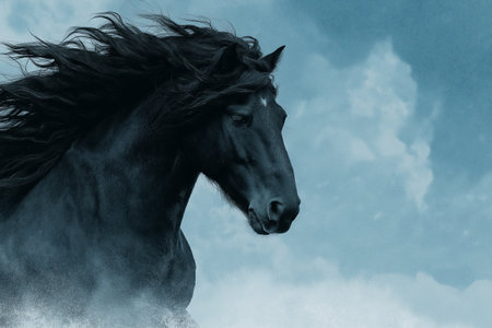 A stunning black horse gallops through the clouds, showing its strength and beauty against a dramatic sky.