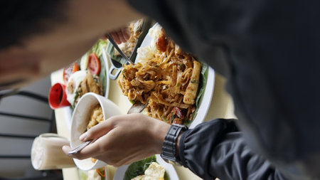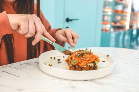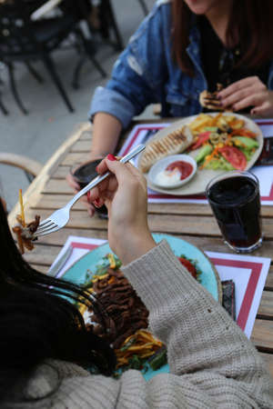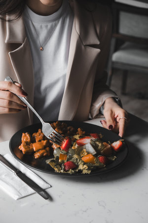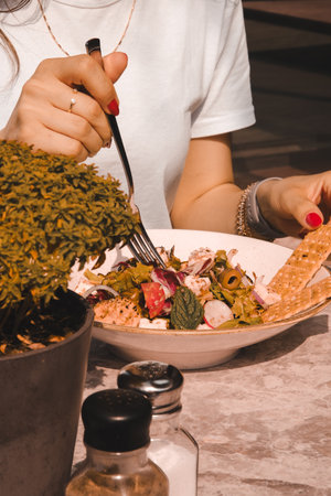 woman in cafe eating salad hands close up no face outdoors restaurant autumn season
