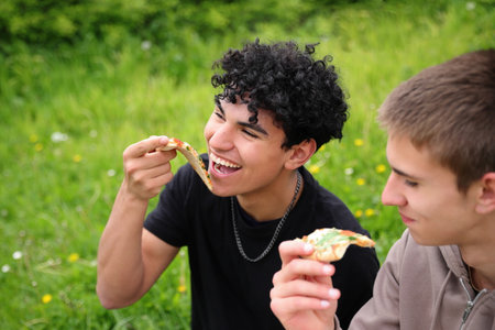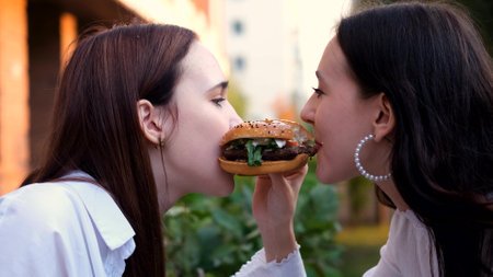 Two teenage friends biting the same hamburger at the same time, two friends eating junk food on the street