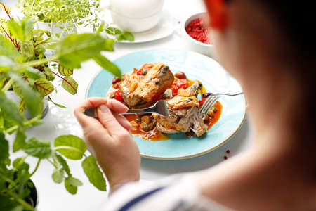 Stewed mackerel in tomato sauce with capers served on toast. Mackerel baked in tomato sauce with capers. Suggestion of serving a dish on a plate. food background
