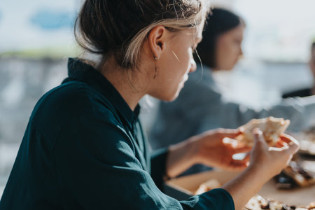 Woman eating vegetarian pizza in a pizzeria restraurant (Selective Focus, Focus on the pizza slice)