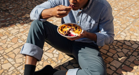African American man eating blueberry dessert from white bowl on a tiled outdoor floor. Sweet pastry with fruit concept.