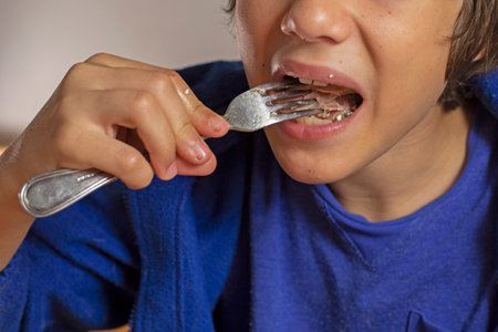 A close-up shot of a person bringing a fork with food to their mouth. The focus on the mouth and utensil captures the act of eating, tasting, and enjoying a meal.