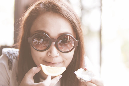 Potrait lovely Asian women eating shellfish raw oyster filtered warmtone picture at resturant