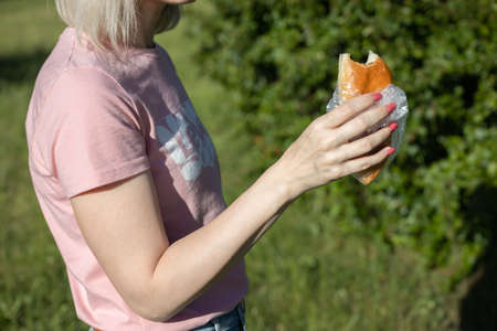 A young woman holding fast food. Close up. The view from the top. The concept of fast food .