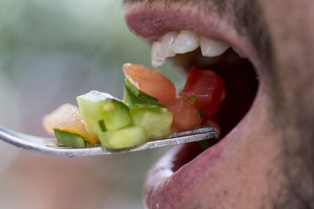 Close up of a bearded young man eating healthy fresh salad with a fork