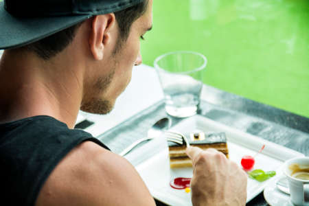 Attractive Young Man Eating Breakfast, Drinking Coffee and Having a Slice of Cake