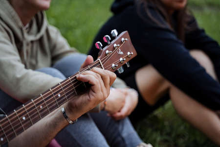 hands of a guy and a girl on a guitar fretboard, learns to play the guitar on the lawn in the park