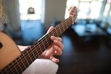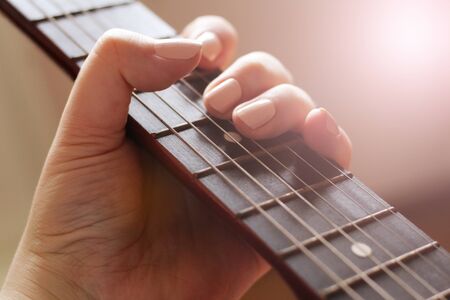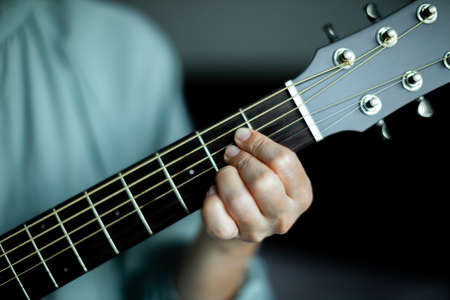 Close focus on hand of woman practices to play cords of acoustic 6 strings guitar in dark room.