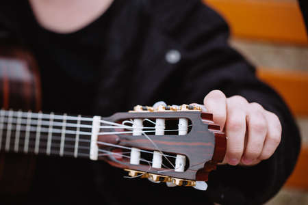 Close-up of teenage boy playing guitar. Male finger on strings making chord. Autumn mood outdoors