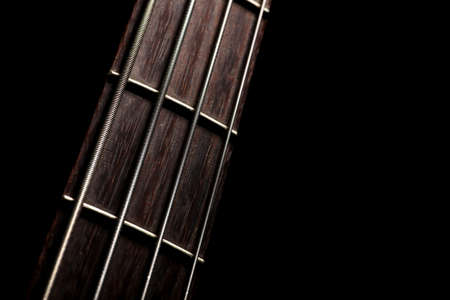 Horizontal detail of the fret board of a bass guitar, on a dark background.