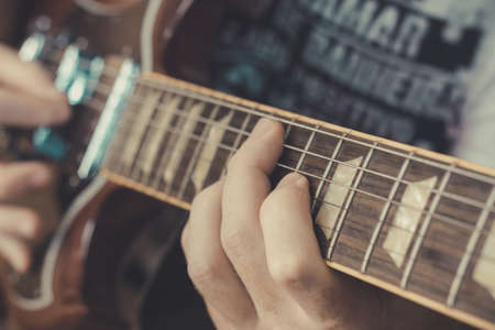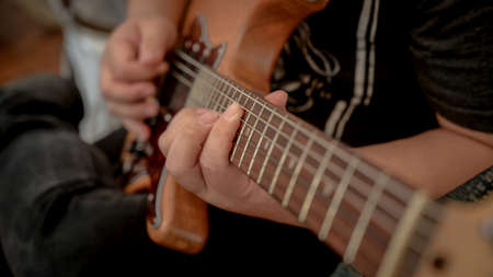 Repetition of rock music band. Cropped image of hands electric guitar player