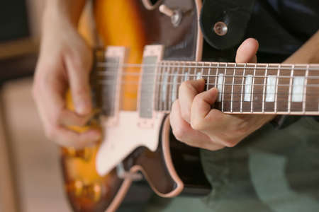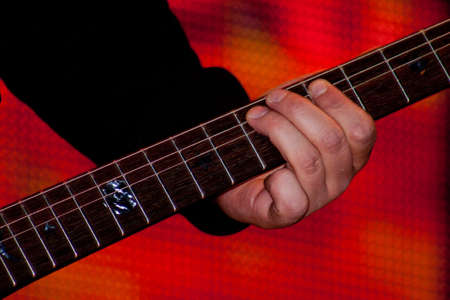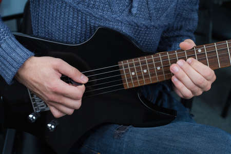 A man plays electric guitar. Macro photo. Front view.