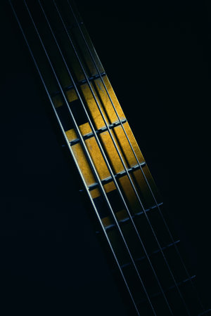 Closeup view of neck of five strings bass guitar, highlighted shapes.