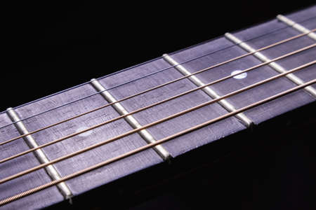 Part of an acoustic guitar, guitar fretboard with strings on a black background with highlights.