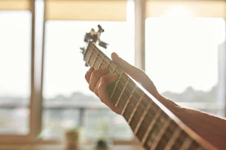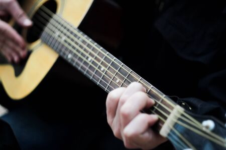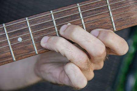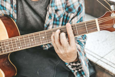 Music instrument. Musician plays and picks chords. Man plays acoustic guitar, clamps the strings Close-up. Daylight. Man's hands playing on a guitar neck, soft focus. Rock, Blues, Jazz, Pop music.