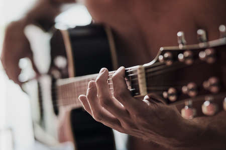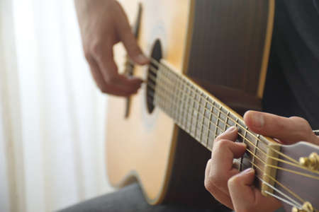 Closeup shot photo of playing the acoustic guitar.