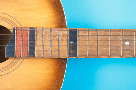 Close-up of acoustic guitar neck on blue background