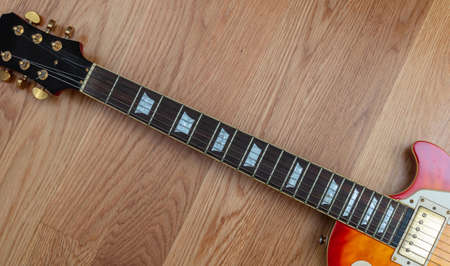 Electric guitar. Top view of a guitar neck body fretboard and headstock against wooden floor background, copy space.