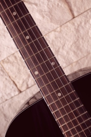 black guitar on a background of stone wall
