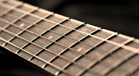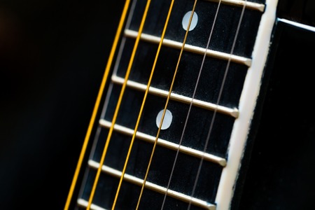 Closeup detail of steel guitar strings and frets for making music. Guitar neck in selective focus.