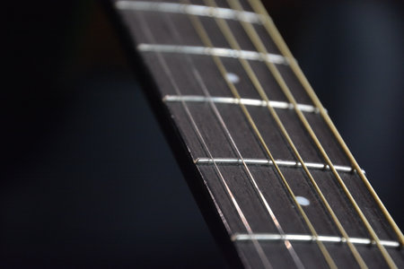 Part of an acoustic guitar, guitar fretboard with strings on a black background with highlights.