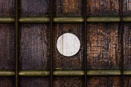 Close-up picture of a guitar with a fingerboard made of wood with a white inlay and a very old guitar string