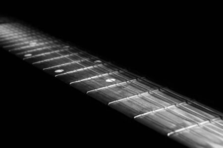 Guitar neck of black electric guitar on dark background
