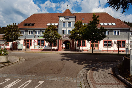 Titisee-Neustadt, Baden-Württemberg, Germany - July 28 2020: View on the exterior of the Titisee railway station with hotel in Breisgau-Hochschwarzwald