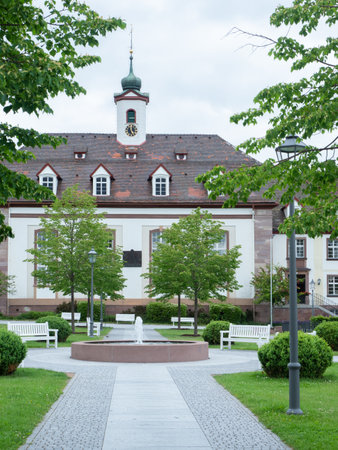 Koenigsfeld, Germany - May 27th 2022: Beautiful garden and protestant church in the centre