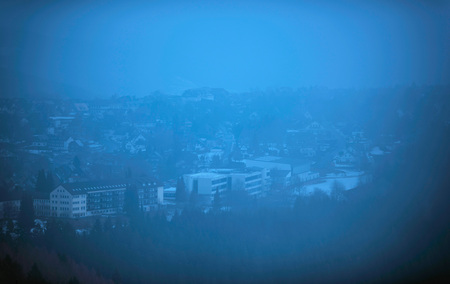 Village in misty mountain valley at dusk. Winterberg, Germany.