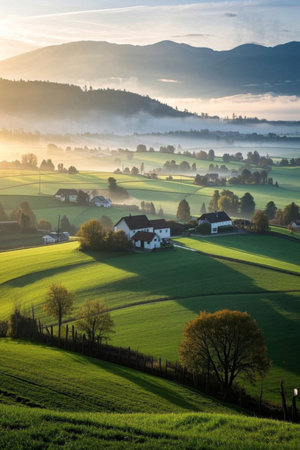 A picturesque landscape of rolling hills, a village, and a winding road bathed in the warm light of a golden hour sunset.