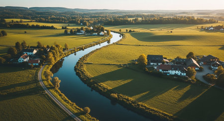 Sky showing scenic aerial view of a winding asphalt road through vibrant green fields and a small village at sunset with golden light casting long shadows across...