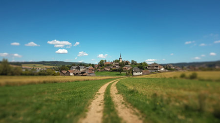 A winding road meanders through rolling green hills and golden fields. A small village with houses and trees is nestled in the landscape under a bright blue sky.