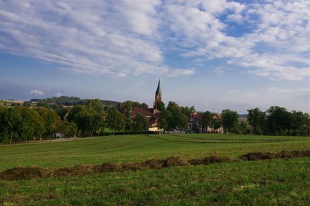 Sunset in the jurassic hills of Upper Franconia, Germany. Lovely Spring evening in the rural countryside near Bamberg. European Scenery