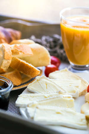 Breakfast served in bed with cheese, fruits, honey and juice