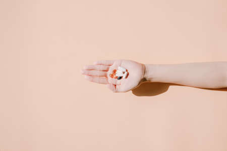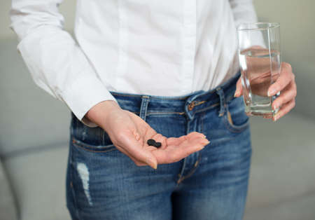 Woman taking medication. Woman takes pills from box. Healthcare concept with medicines.