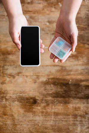 top view of young woman holding smartphone with blank screen and medication in pill organizer