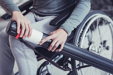 Technical drawing. Close up of a technical blueprint being in the tube in the hands of a smart disabled engineer