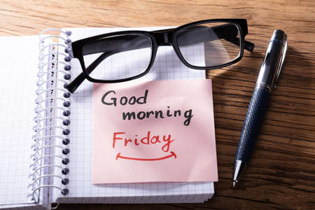 Eye Glasses And Adhesive Note With Good Morning Friday Text On Notepad