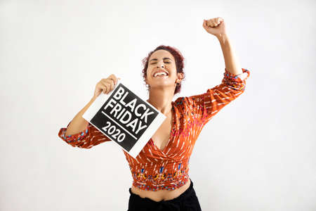 Very happy girl with closed eyes celebrating the arrival of Black Friday, raising one hand with a closed fist and with the other hand holding a Black Friday poster. Young woman with white skin and curly red hair dressed in colorful patterned clothing