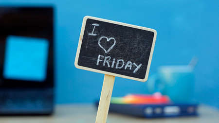 I love friday written on a chalkboard, in the background a office