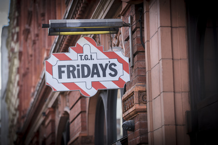 London, Greater London, United Kingdom, 7th February 2018, A sign and logo for TGI Fridays restaurant