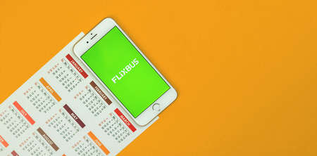Kharkov, Ukraine - February 5, 2021: European transportation service Flixbus application on Apple smartphone screen, creative flat lay banner and background photo