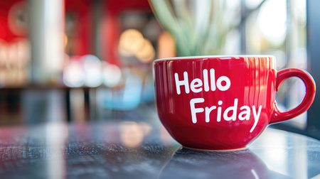 hello friday coffee cup stand on table on sunny day animation