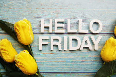 Hello Friday alphabet with yellow tulip flower on wooden background