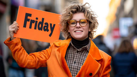 Happy woman in suit holding a friday sign, party concept with blurred night city background