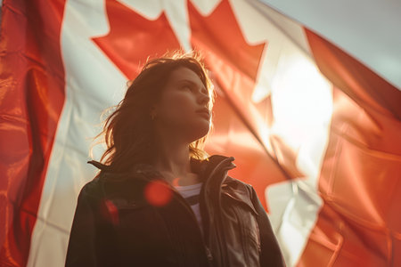 A woman stands tall with the Canadian flag, bathed in the warm glow of the setting sun