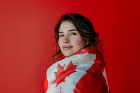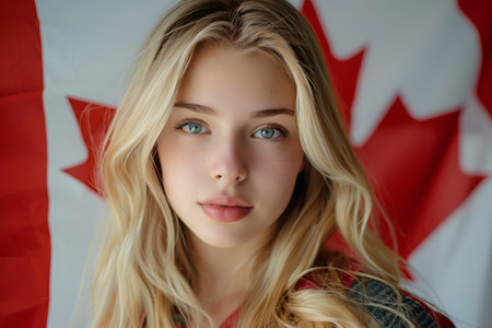 A woman stands in front of the Canadian flag, showcasing a serene and patriotic expression