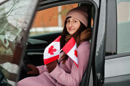 Young woman with Canada flag sitting on car.